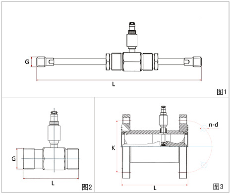 傳感器的安裝方式根據規格不同采用螺紋或法蘭連接,安裝方式見圖1.圖2,圖3